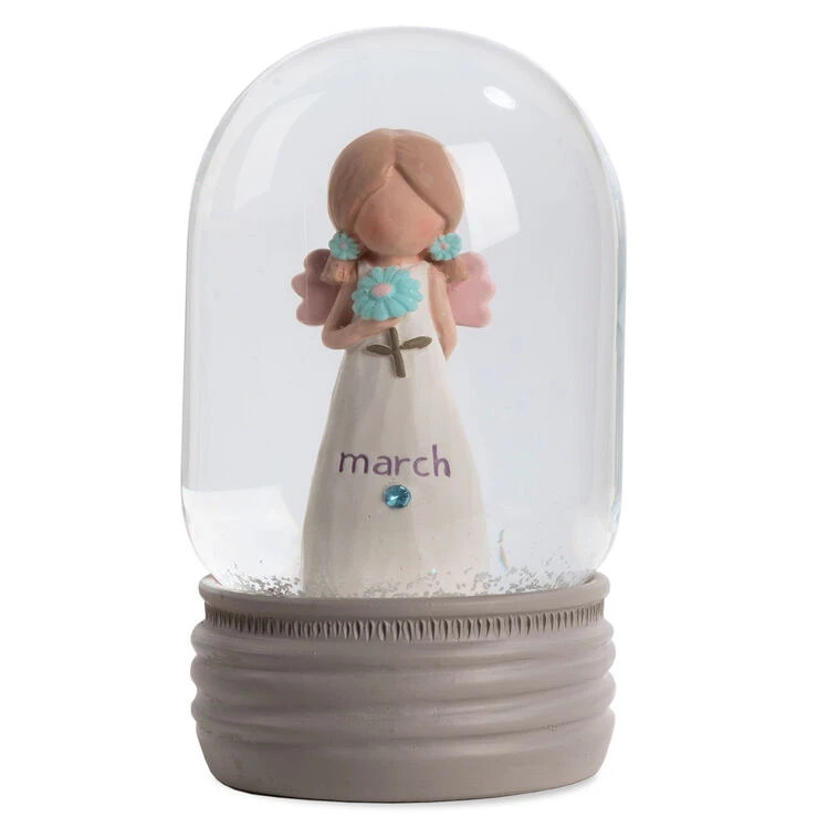 Bring a touch of magic to your home with this March Birthstone Angel Snow Globe from Blossom Bucket. This enchanting snow globe features a little angel holding a single blue flower, and is adorned with a matching gemstone representing March’s birthstone (aquamarine). Shake the globe to create a flurry of sparkling snowflakes that swirl around the angel, creating a peaceful and serene scene. This cheerful collectible makes a great gift for friends, family members or co-workers with March birthdays.