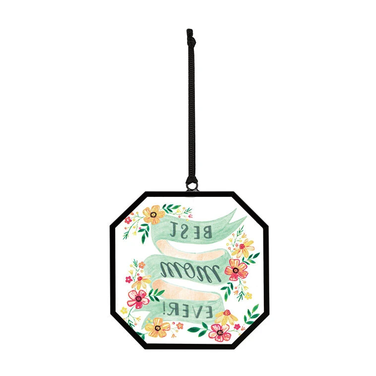 Bring a beaming smile to your mom’s face with the charming design on this glass suncatcher from Demdaco. A “Best Mom Ever!” banner surrounded by painted flowers add a colorful touch to this octagonal suncatcher. Hang it up in a window by its ribbon hanger and let the light shine through! Boxed suncatcher makes a sweet birthday or Mother’s Day gift with its loving message.