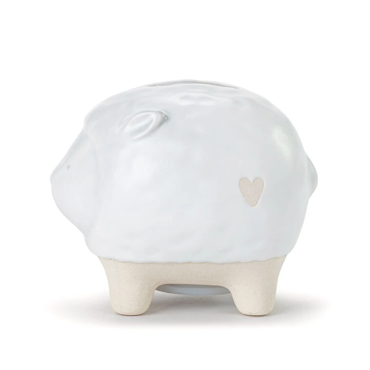 Decorate a nursery with this sweet ceramic lamb bank for baby. Fill this cute bank with coins to start their college fund for a thoughtful and fun baby shower gift. Or let a little one watch their treasure grow as they do—while also learning the value of saving as they add coins and dollars into the slot. This adorable little lamb savings bank comes with a cute and punny hangtag and a dimpled wool design.