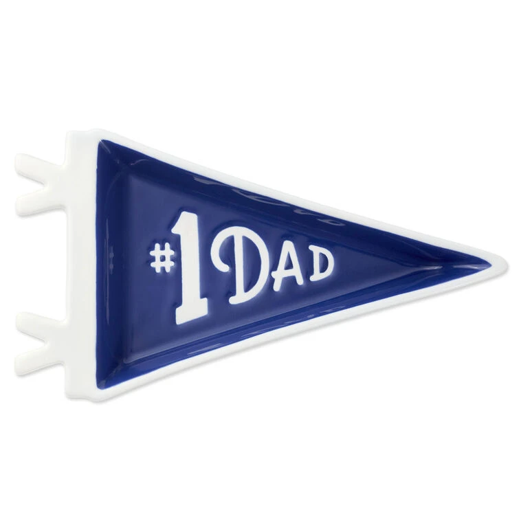 Give dad a banner day and dish up a big helping of appreciation for him with this cute trinket tray. Pennant-shaped ceramic tray features a “#1 Dad” message in white lettering on a navy blue background with white “tie” accents along the edge. This fun valet tray is 1″ tall so it holds a lot of ticket stubs, mementos, pocket change and more. Keep his pockets light and his heart full with this fun, giftable trinket dish just for him.