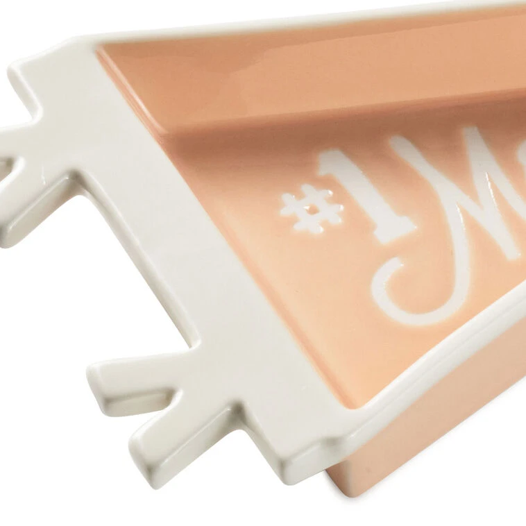 Lead the cheers for mom and serve her up a big win with this cute trinket dish. Pennant-shaped ceramic tray features a “#1 Mom” message in white lettering on a peach background with white tie accents along the edge. This fun desk or dresser accessory is 1″ tall so it holds a lot of ticket stubs, mementos, pocket change and more. Keep her pockets light and her heart full with this fun, giftable trinket dish.