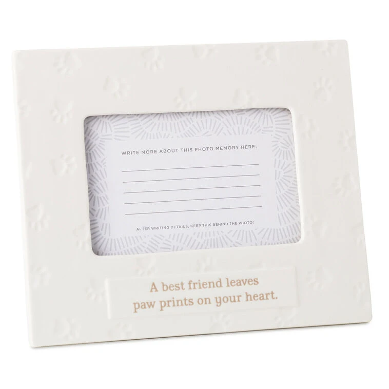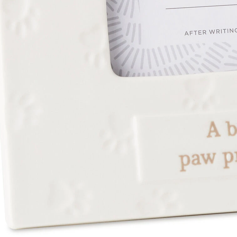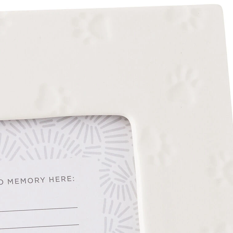 - Cream picture frame features debossed paw print designs and a raised caption area with a loving message about a pet.