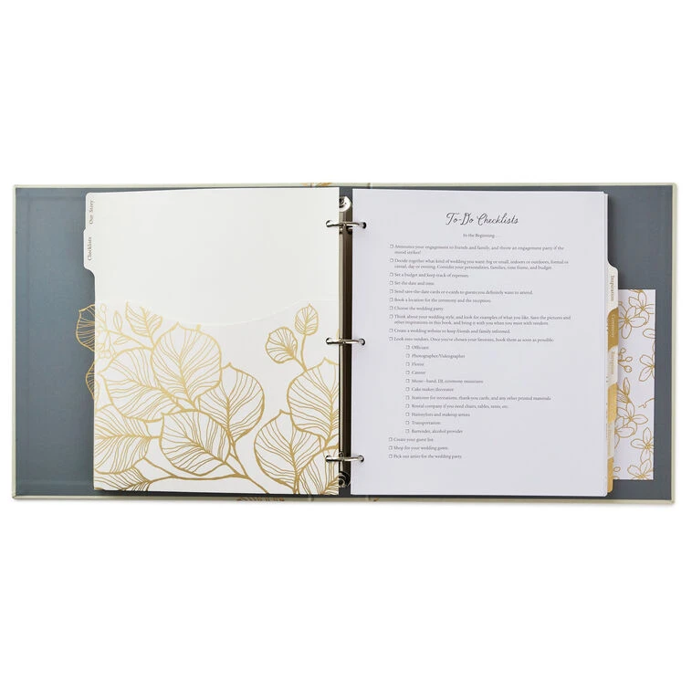 - Wedding planner 3-ring binder features fabric cover with debossed, gold foil design.