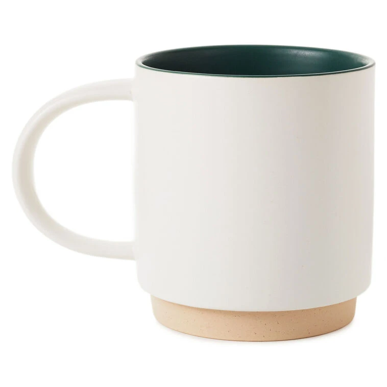 - White mug features a retro lettering design and green interior, an extra-wide handle and recessed bottom designed for stacking.