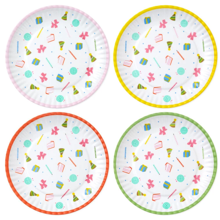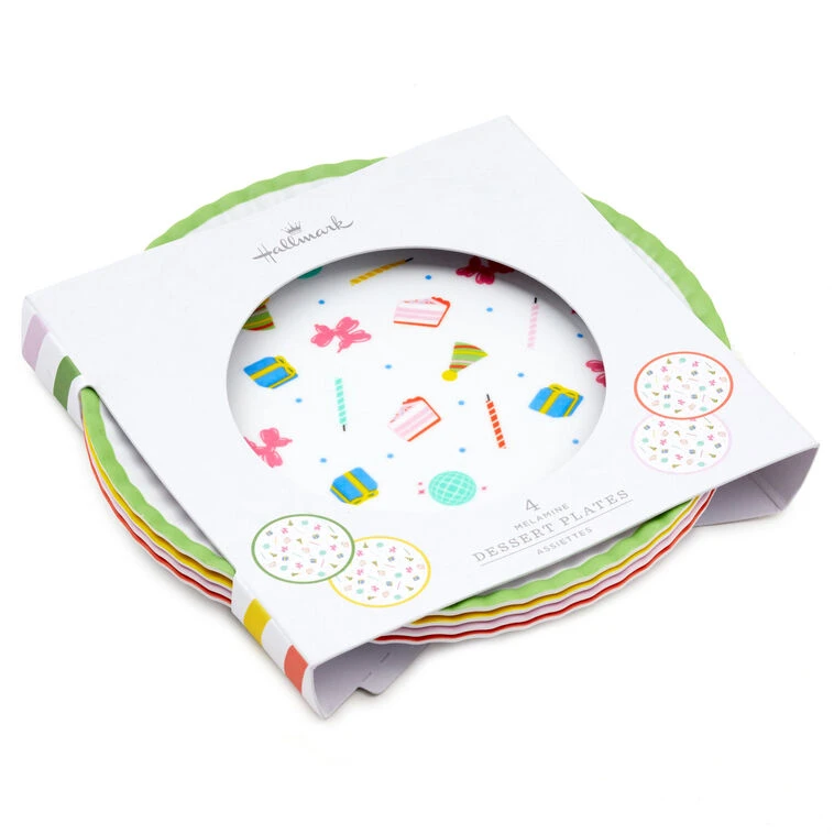 - Set of 4 melamine dessert plates feature party icon designs and assorted colors of trim.