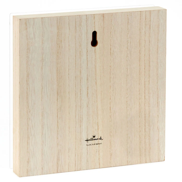 - Square wood quote sign features a blue house shape and a message on the top acrylic layer.