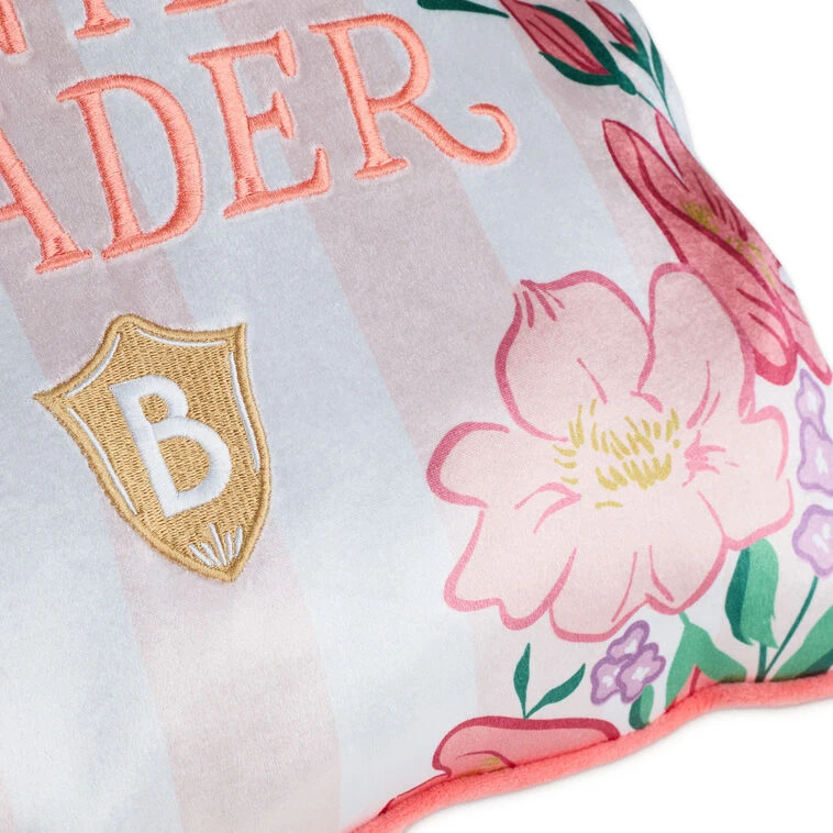 Cuddle up with a good book and this delightful pillow at your service. Decorative throw pillow in pink-and-white-striped satin features a Bridgerton-inspired message framed by coral, pink and lavender flowers and coral-pink piping. Dress up a bedroom, boudoir, sitting room or cozy reading nook with this feminine pillow embroidered with Lady Whistledown’s favorite opening phrase.