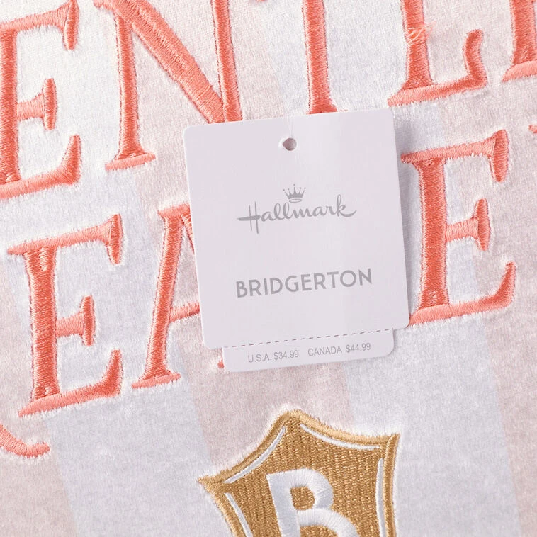 - Bridgerton throw pillow features bold flowers framing an embroidered message on a pink-and-white-striped background.