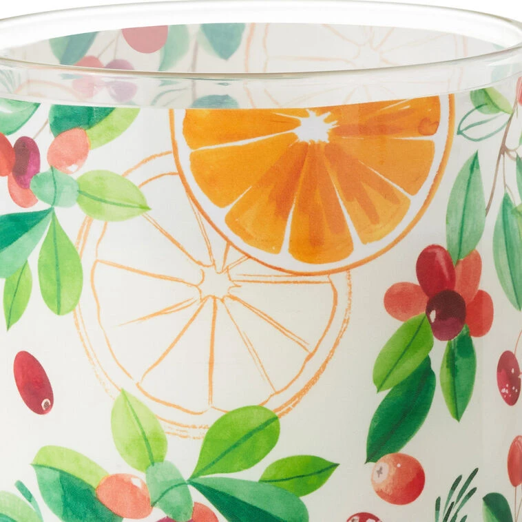 - Soy-blend wax glass jar candle features illustrations of cranberries and orange slices with a cork lid.