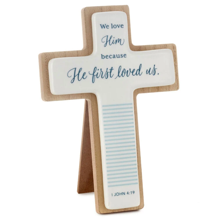Add a reminder of God’s love to your home with this elegant cross that features a Bible quote from the book of I John. A Scripture verse in blue print and script lettering is centered atop ceramic with a rounded-edge wood layer on back. Display this item of faith on a bedside table, wall or dresser top to inspire you every day. It also makes a great gift of encouragement for a friend or loved one.