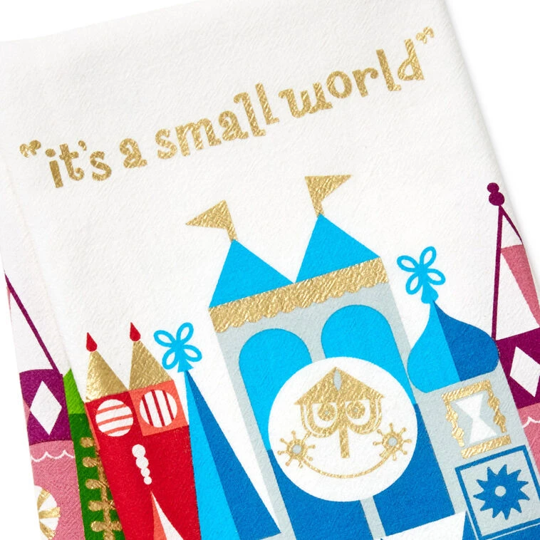 - Disney “It’s a Small World” tea towel features colorful designs on white.