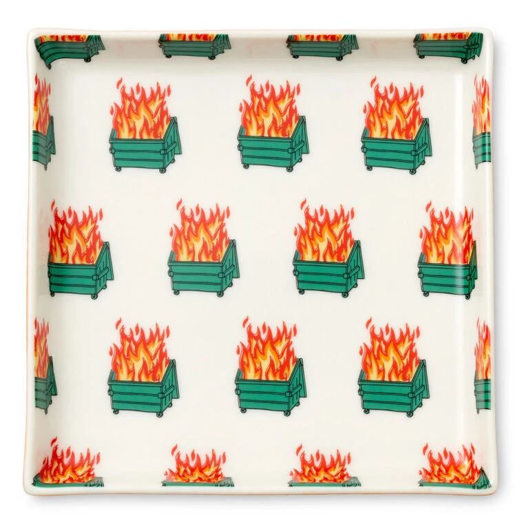 - Square trinket tray features a raised edge and funny dumpster fire design.