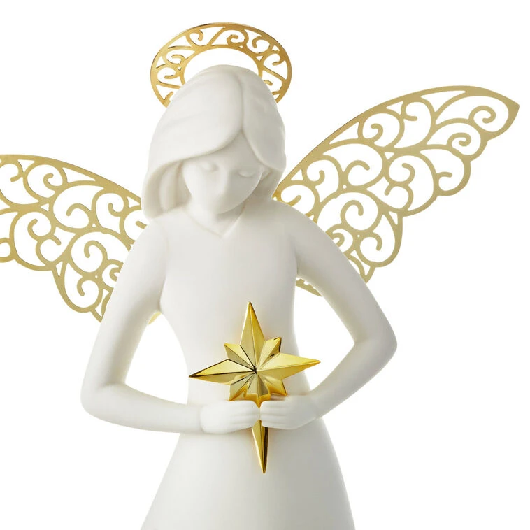 - Lighted angel figurine designed by Joanne Wright holds a star in her hands and features gold plating on her wings and halo.