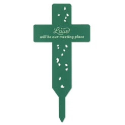 - Decorative garden stake features a dark green cross design with a message and cutout leaf shapes.