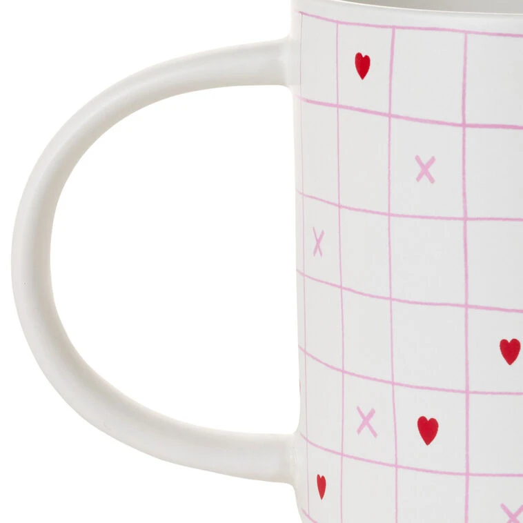 - White mug features a pink grid pattern with X and heart designs, an oversized handle and a recessed base for stacking.