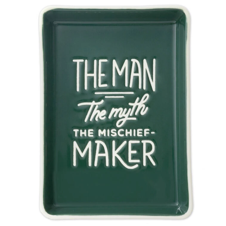 Acknowledge the joker in the family deck with this fun trinket tray for him to hold all his stuff. Ceramic tray features embossed white lettering on a forest green background. This fun valet tray is 1″ tall so it can hold pocket change, keys, mischief-making necessities and more. Rectangular dish makes a great gift idea for dad, husband, brother and more.
