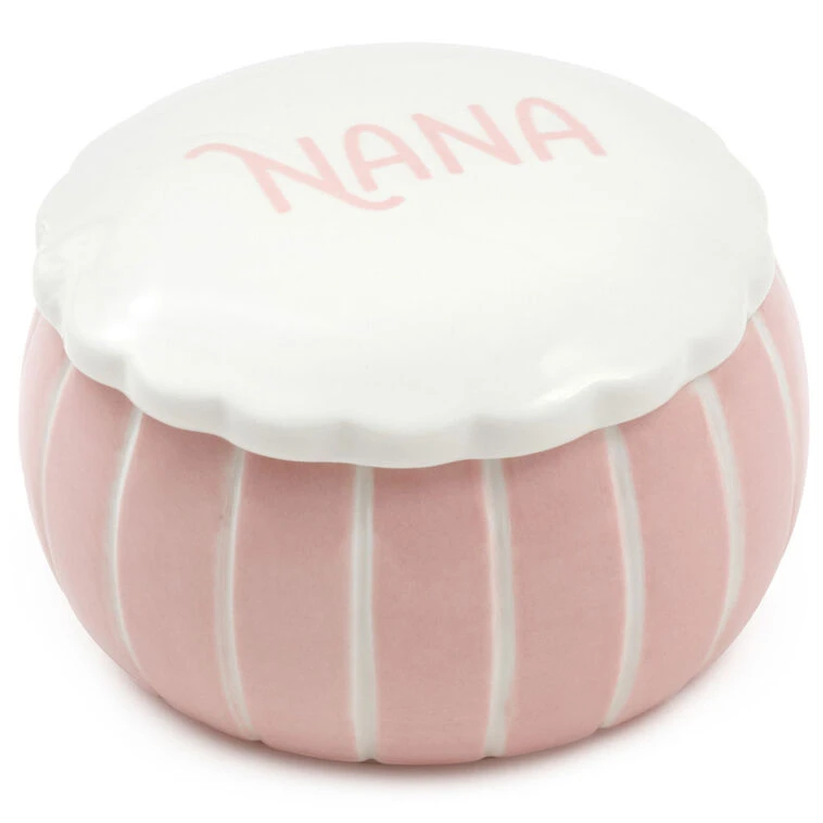 Give your nana a place to hold tiny treasures and mementos with this lidded trinket dish. Pink and ivory ceramic bowl features a scalloped lid with “Nana” lettering and a message inside the well of the dish. Pretty dish makes a sweet Mother’s Day or birthday gift for the best keeper of your secrets and love.