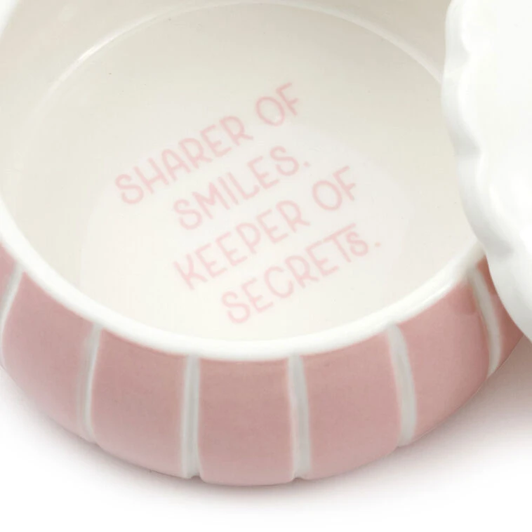 - Round trinket dish features pink glazing with debossed white stripes and a scalloped white lid with pink lettering.