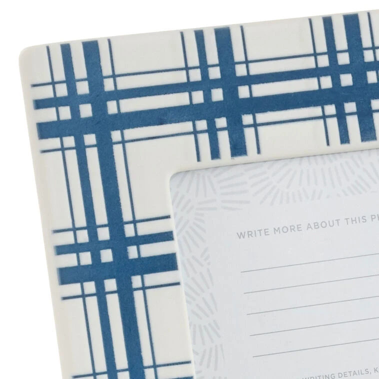 - Blue and white plaid picture frame with raised caption area below the opening.