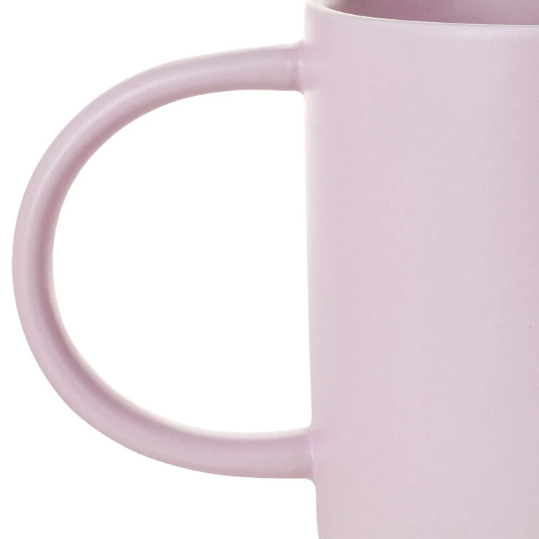- Electric lavender mug features navy blue lettering, an oversized handle and a recessed base for stacking.