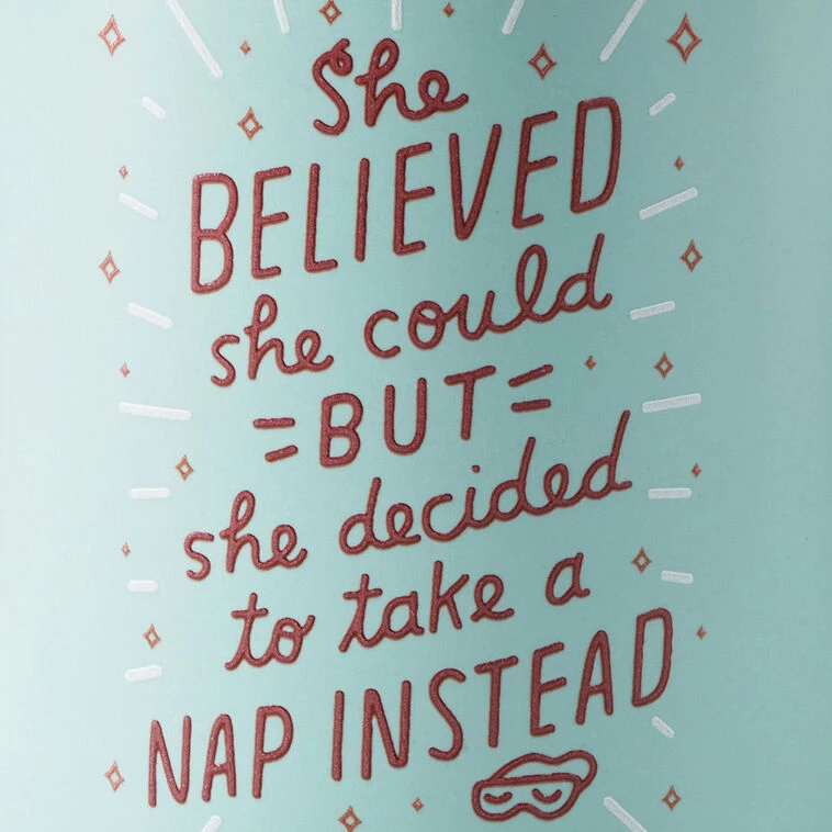 Believe in yourself and good sleep habits with this funny mug from Shoebox. Modern styling and an oversized handle make this ceramic coffee cup a must-have when it comes to getting things done and getting naps in. Colorful mug holds 16 ounces and features a matte aqua blue glaze with a hot pink message.