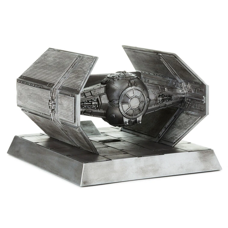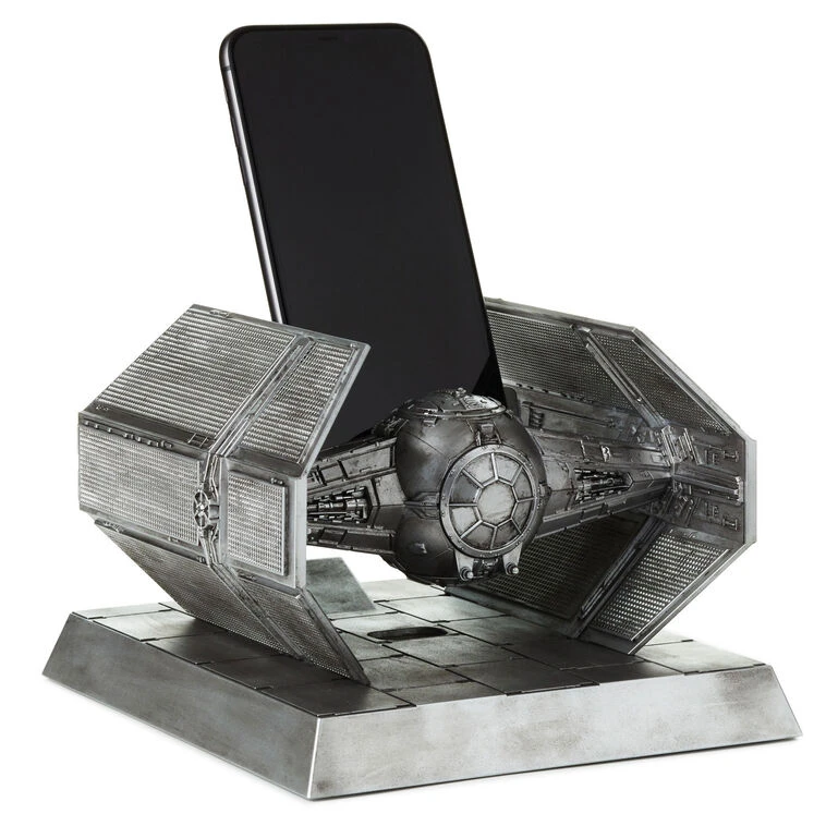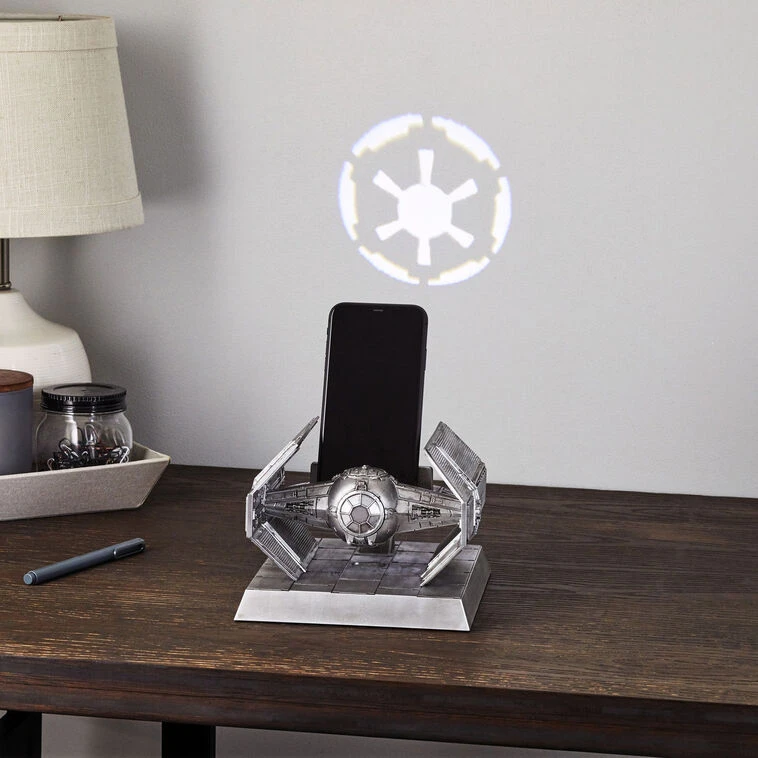 - Star Wars phone stand features Darth Vader’s TIE Fighter design with projecting blue light.