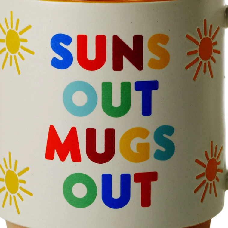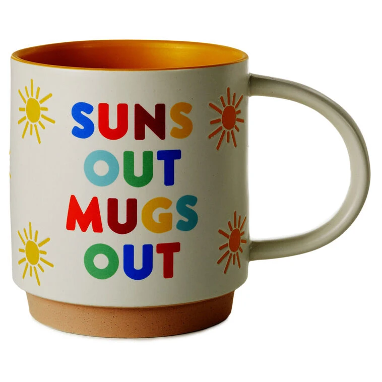Bask in the warmth of the sun and the morning blend in your hands with this cute “Suns Out, Mugs Out” cup. White ceramic mug with colorful message and sunshine designs around the perimeter includes a yellow glazed interior and an oversized handle. Sunny-themed mug makes a great gift of encouragement, teacher appreciation and more.