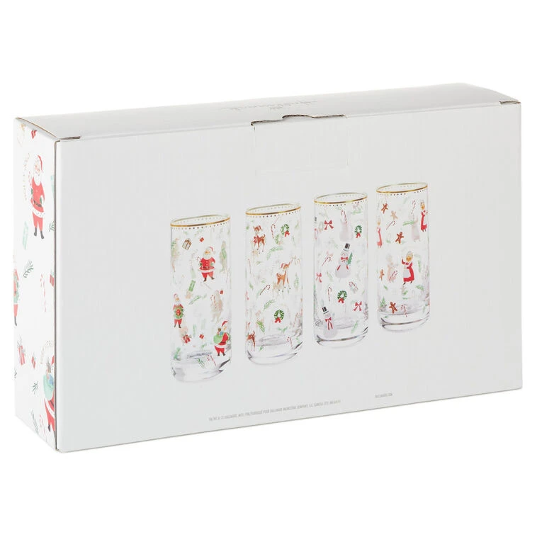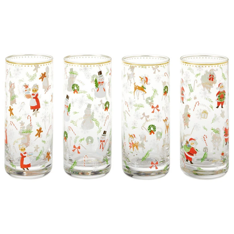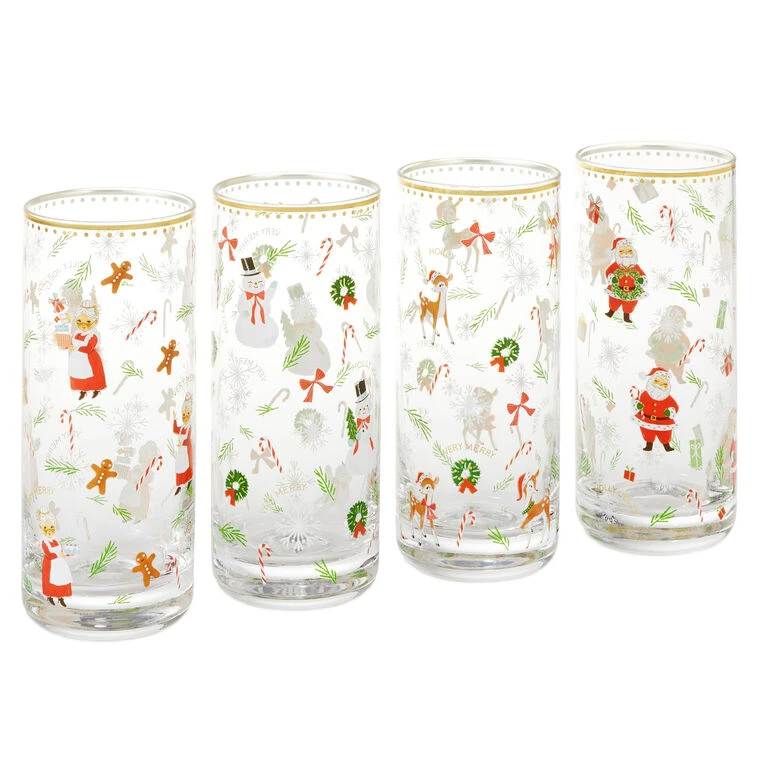 Add a little vintage Christmas charm to all your meals with this set of four drinking glasses featuring assorted holiday designs and gold foil trim. Each glass displays a different Christmas friend—Santa Claus, Mrs. Claus, a snowman and a reindeer—amid festive illustrations of candy canes, wreaths, presents and more. These fun beverage glasses hold 12 ounces each.