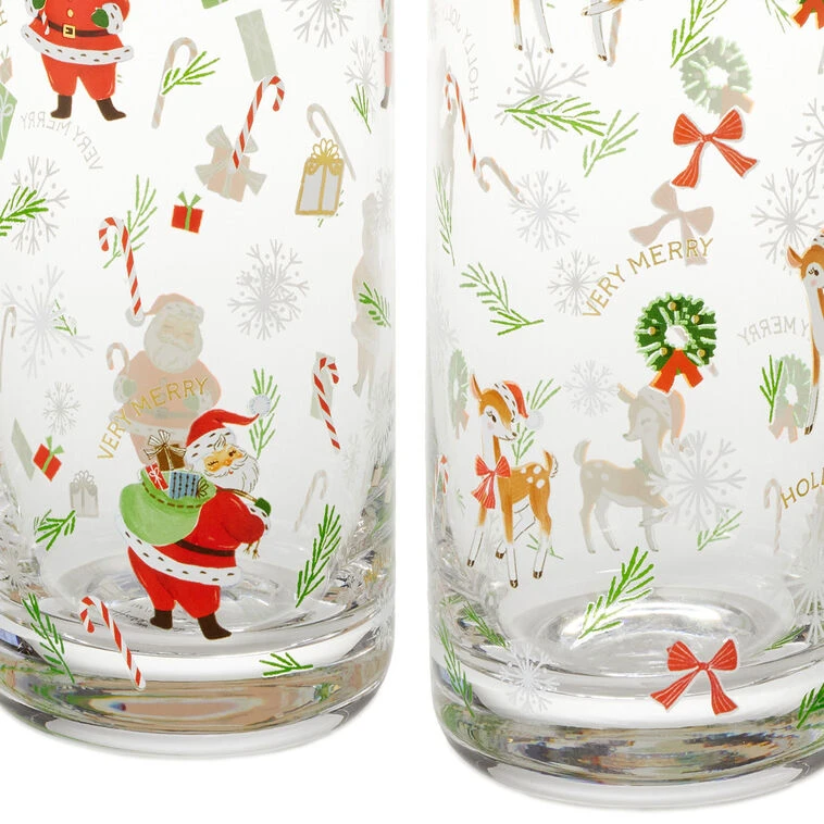 - Drinking glass set includes four assorted holiday designs featuring Santa, Mrs. Claus, a snowman and a reindeer, all with gold foil rims.