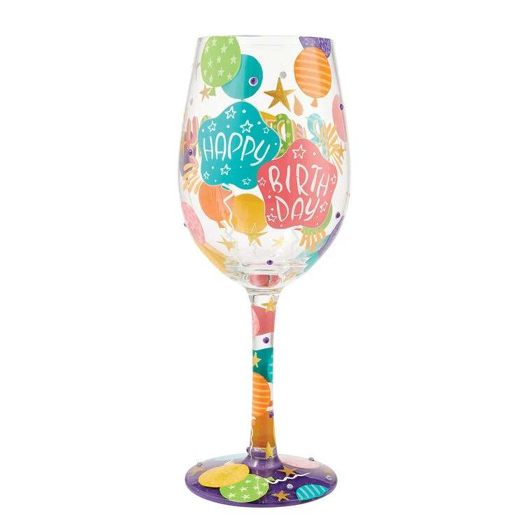 - Lolita handpainted and artisan blown wine glass features colorful balloons, stars and bedazzled crystals and a happy birthday message.